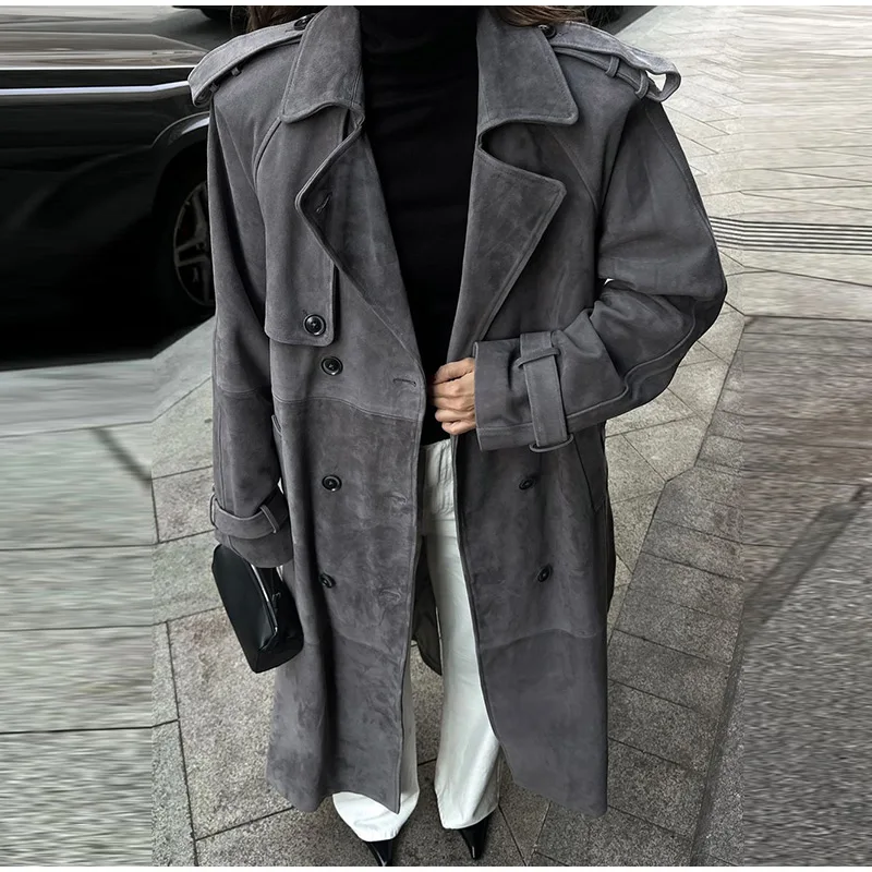 Elevate your wardrobe with the Teresa Trench Coat, a velvety-soft suede trench designed with a full-length silhouette, wide lapel collar, and a sculpted belted waist. Its blend of classic detailing and modern street-style structure makes it the perfect statement piece for effortless luxury, day or night.